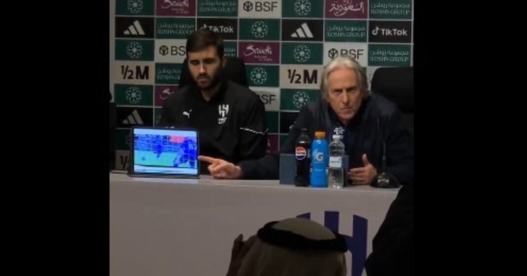 Jorge Jesus se sentó en la conferencia de prensa y atendió al árbitro Iván Barton, nacido en El Salvador. Usando una tablet para mostrar y explicar dos jugadas puntuales, se descargó con todo: «Creamos varias oportunidades de gol, pero el árbitro también intervino para evitar otras. Hay dos claros penaltis que no dejan lugar a dudas. La falta sobre Malcom es penalti en cualquier parte del mundo; simplemente no es penalti en El Salvador. ¿Está el jefe de árbitros en Arabia Saudita enviando árbitros de El Salvador para dirigir los partidos de Al Hilal? ¿Hay fútbol en El Salvador? ¿Cuál es la estrategia aquí? Son incapaces de analizar, y estamos siendo penalizados. ¿Quieren pruebas? ¿Cómo no es un penalti el incidente de Malcom? ¿Cómo puede un árbitro no otorgar un penalti en esa jugada? Solo en El Salvador sucede esto. No hay fútbol profesional en El Salvador; es fútbol amateur».